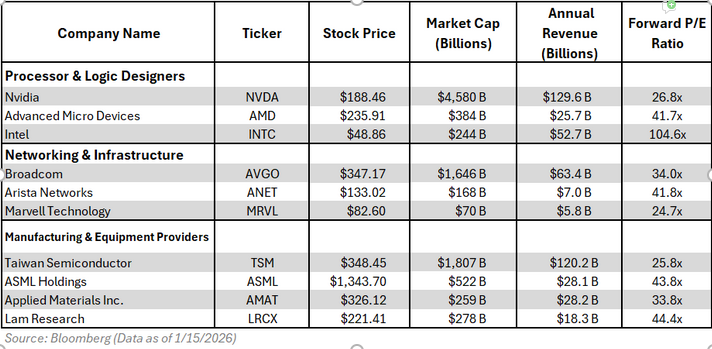 Demand for AI computing remains strong, but much of this optimism is likely already reflected in current share prices. As the table illustrates, forward price-to-earnings multiples of 30x, 40x, or higher are now common across the semiconductor sector. Despite a market capitalization approaching $4.5 trillion, NVIDIA trades at a relatively modest 26.8x forward earnings, which may look attractive on a relative basis. Taiwan Semiconductor Manufacturing also appears fairly valued given its near monopoly in leading-edge chip fabrication. Intel, on the other hand, is valued at over 100x earnings, a figure largely driven by temporarily suppressed profits amid its ongoing turnaround efforts. Ultimately, investors must weigh compelling growth prospects and durable competitive advantages against stretched valuations. It’s worth remembering that owning a great company does not automatically translate into owning a great stock.